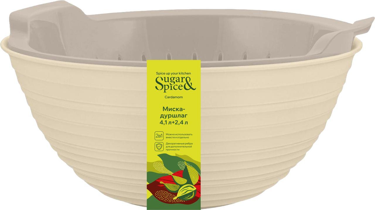Миска-дуршлаг Sugar&Spice Cardamom 4,1 + 2,4л – функциональная посуда, позволяющая помыть и сразу подать на стол фрукты, овощи, ягоды и зелень и т.д. В отличие от обычного дуршлага в миске удобно промывать мелкие продукты, в том числе крупы. Лишняя жидкость будет сливаться в миску, а не на рабочую поверхность, что делает набор наиболее практичным. Гладкие стенки легко отмываются от загрязнений, в том числе жира. Набор удобно хранить, так как он экономит драгоценное место на кухне благодаря своей компактности. При необходимости дуршлаг можно вынуть и использовать миску для хранения и подачи продуктов на стол. Объём дуршлага 2,4л, объём миски 4,1л. Размер изделия: 25,7х25х12,3см. Температурный режим: от -5°C до +70°C.