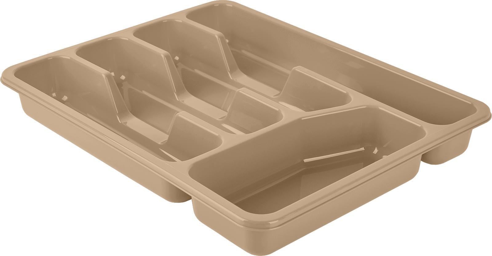 Лоток для столовых приборов Plast Team позволит содержать ящики кухонного стола в полном порядке. Оптимально организуйте пространство с помощью пяти отсеков, разложив вилки, ложки, ножи и прочие столовые принадлежности по-отдельности. Большой отсек подойдет для хранения рулона с пакетами для завтраков. Легкий, прочный, пищевой пластик прослужит долгие годы и будет безопасен для здоровья. Материал не боится воды, лоток можно мыть в посудомоечной машине, поэтому уход за ним не составит труда. Размеры 330х260х43 мм