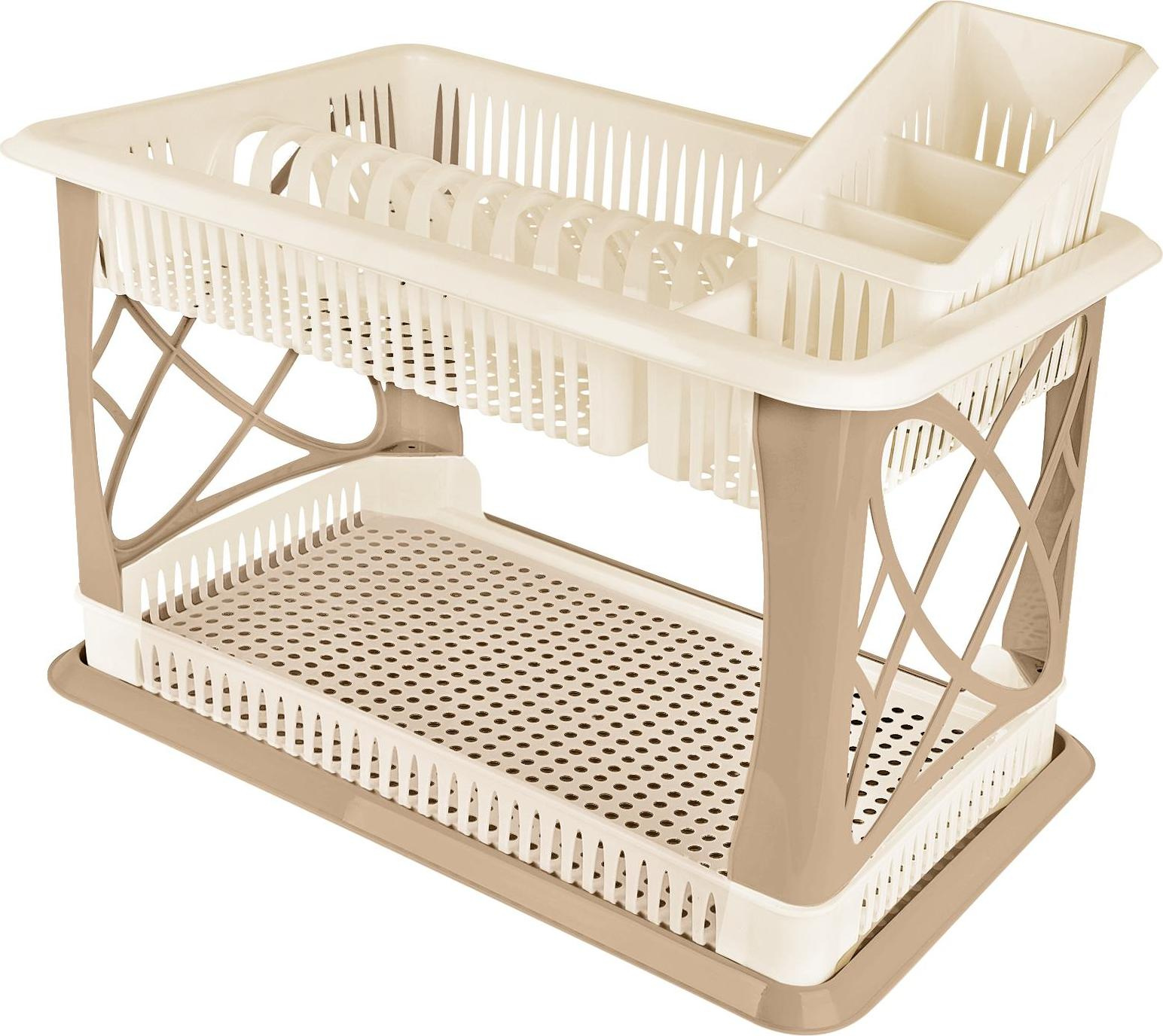 Сушилка для посуды и столовых приборов двухъярусная  – удобный аксессуар, который позволяет сушить и хранить еще большее количество посуды на кухне. Имеет секции для тарелок и отдельную сушилку для столовых приборов – это дает возможность организовать оптимальное хранение и сушку, а также сэкономить свободное пространство. При необходимости, можно использовать сушилку под столовые приборы как самостоятельный предмет в шкафу или возле раковины. Посуда и приборы высыхают намного быстрее благодаря дизайну с отверстиями. Сушилка имеет поддон для стока воды, за которым просто ухаживать и содержать в чистоте. Легкий, прочный, пищевой пластик прослужит долгие годы и будет безопасен для здоровья. Можно использоваться как в кухонном шкафу, так и выставить на рабочую поверхность.