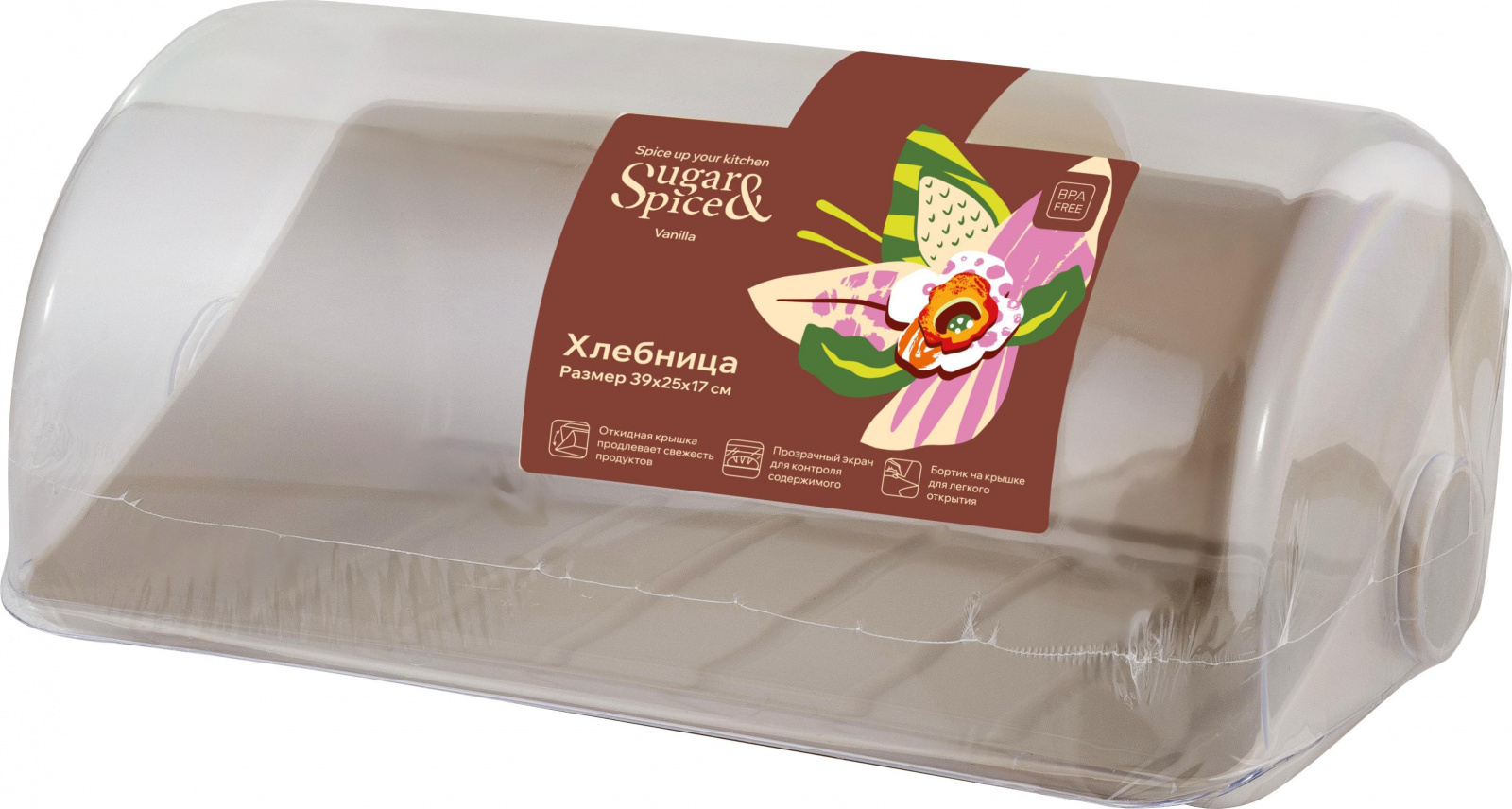 Хлебница Sugar&Spice Vanilla удобна и практична в использовании благодаря универсальной форме. Лаконичный дизайн идеально впишется в интерьер любой кухни. Оптимальный размер позволяет хранить хлебобулочные изделия для всей семьи, при этом хлебница не занимает много места. Благодаря прозрачному экрану можно всегда увидеть количество содержимого и вовремя пополнять запасы. Экран плотно прилегает к основанию, тем самым хлеб всегда остается свежим и вкусным. Размер хлебницы: 39,5х25х17,7 см. Температурный режим:от -5°С до +70°С.
